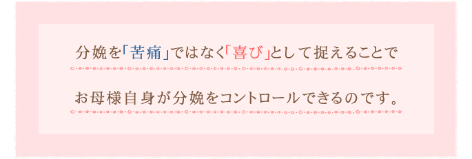ソフロロジー式分娩とは、単に分娩を乗り切るためのものではなく、妊娠中からのイメージトレーニングで母性を育み、「陣痛は赤ちゃんを生み出すための最も大切なエネルギー」として受け入れ、ご家族に見守られながら、最高にリラックスした状態の中、笑顔で赤ちゃんの誕生を迎えるものです。